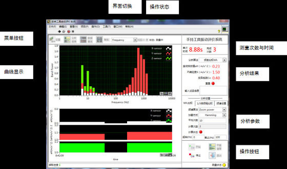ソフトウェアインターフェースは、操作ボタン、メニューボタン、曲線表示インターフェース、解析設定、解析結果で構成されています。ユーザー操作を容易にするために、分析設定と表示インターフェイスが上部インターフェイスに表示されます。インターフェイスの切り替えにより、時間領域曲線、振動エネルギー レベル曲線、1 ≤ 3 オクターブ曲線、パワー スペクトル曲線、および測定プロセスのテスト データ分析インターフェイスを表示および切り替えることができます。